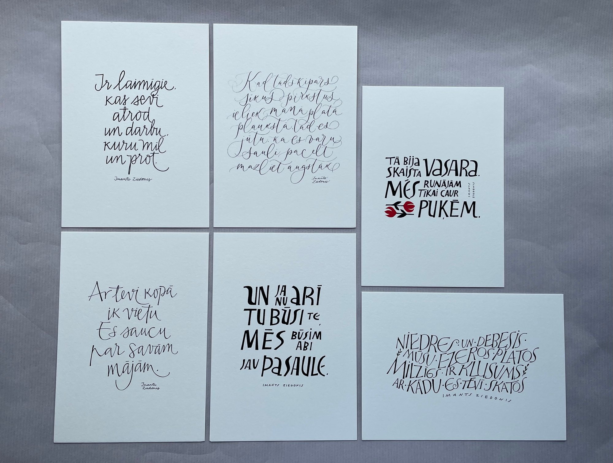 6 citāti, kur katrs burts zīmēts un rakstīts ar rūpību, lai vizuāli pastiprinātu teksta nozīmi un noskaņu.
